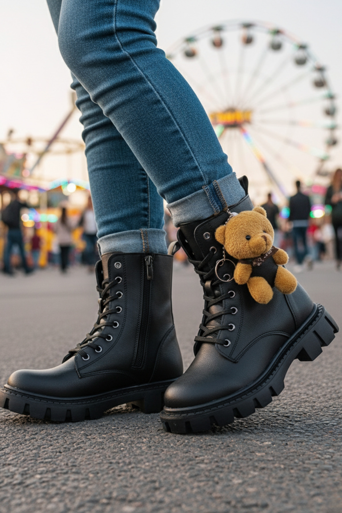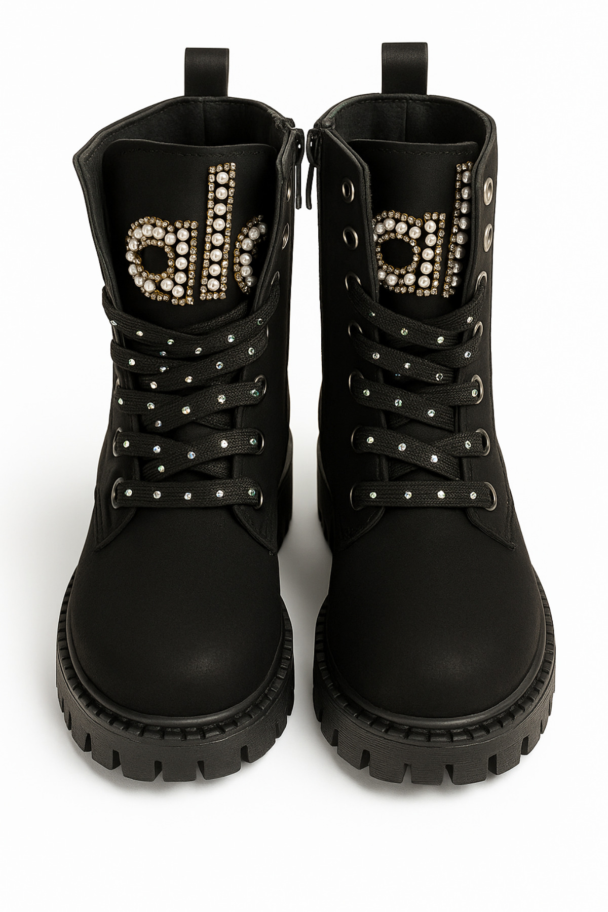 Kız Çocuk Siyah Postal Bot Taş Detaylı Bağcıklı Fermuarlı
