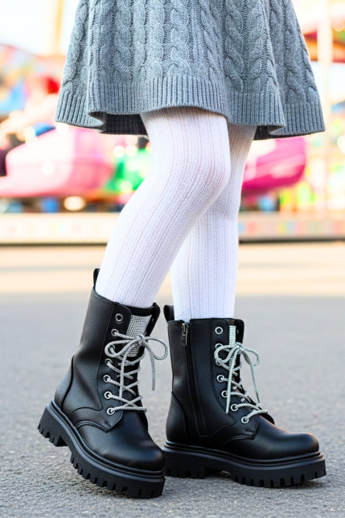 Kız Çocuk Siyah Postal Bot Taş Detaylı Bağcıklı Fermuarlı