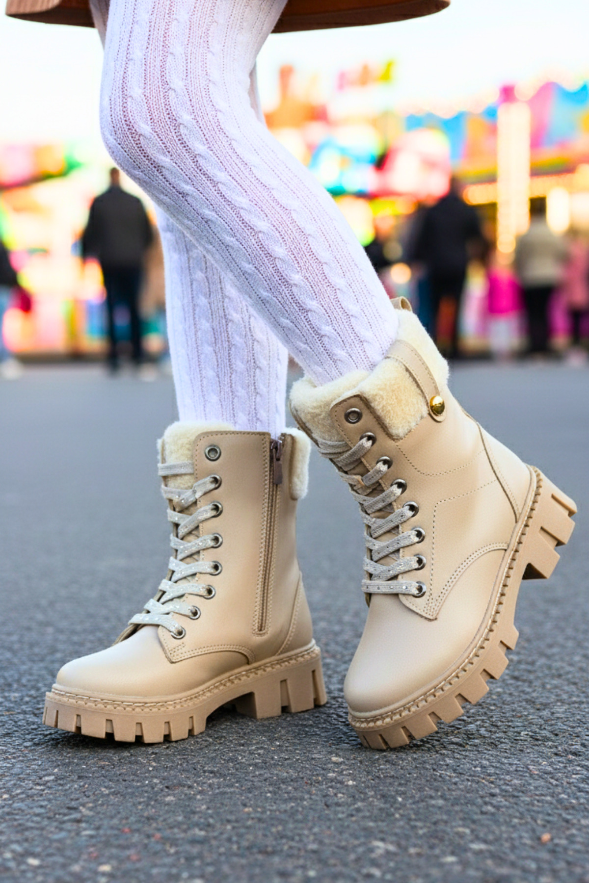 Kız Çocuk Kürklü Kalın Tabanlı Bot – Bej, Bağcıklı Fermuarlı, Kışlık Bot