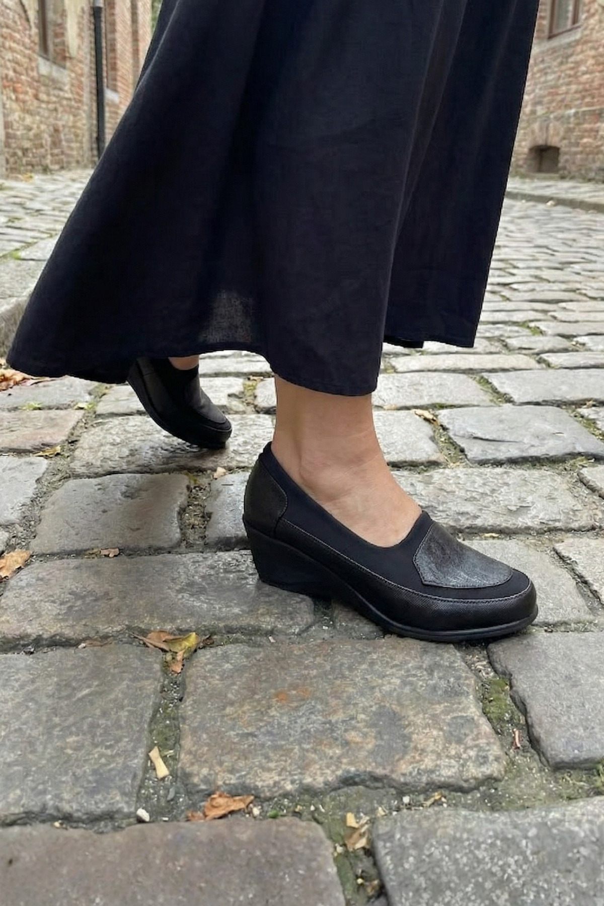 Gün boyu ayakta kalan ve ayağında ağrı hissetmek istemeyen kadınlar için tasarlanan bu siyah anne ayakkabısı, ortopedik tabanı ve dengeli dolgu topuğu ile maksimum konfor sunar.; Esnek üst yüzeyi sayesinde ayağı sıkmaz, taraklı ve hassas ayaklar için uygundur.; Kaymaz tabanı güvenli adımlar sağlar, hafif yapısı uzun süreli kullanımlarda yorgunluğu azaltır.; Günlük kullanımda, iş hayatında ve uzun yürüyüşlerde rahatlıkla tercih edilebilir.