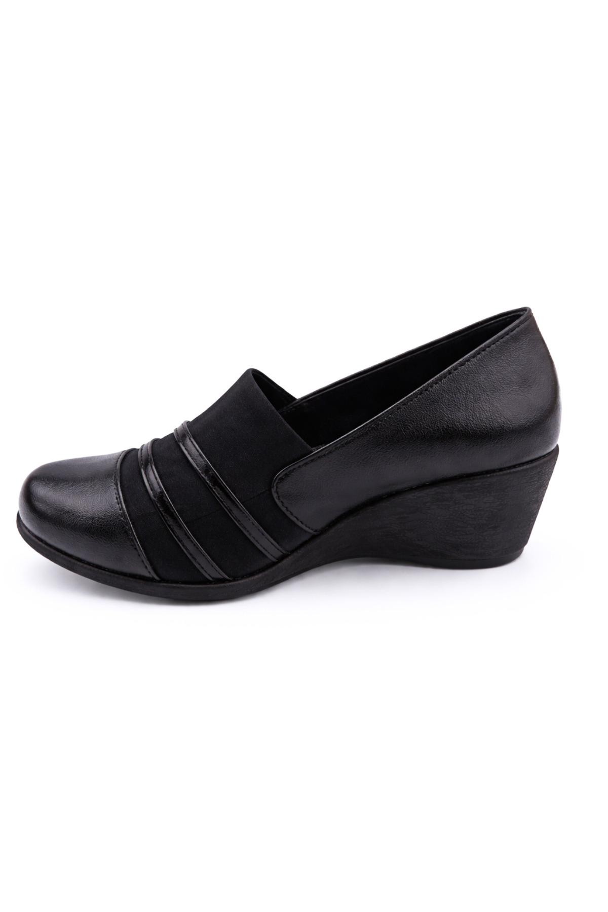 Şıklığı ve konforu bir arada isteyen kadınlar için tasarlanan bu siyah anne ayakkabısı, ortopedik tabanı ve dengeli dolgu topuğu sayesinde gün boyu rahat kullanım sunar.; Ön yüzeyindeki esnek ve yumuşak yapı ayağı sıkmaz, özellikle taraklı ve hassas ayaklar için idealdir.; Zarif çizgili tasarımı sayesinde klasik ve günlük kombinlerle uyum sağlar.; Kaymaz tabanı güvenli adımlar sunarken, hafif yapısı uzun süre ayakta kalınan günlerde yorgunluğu azaltır.