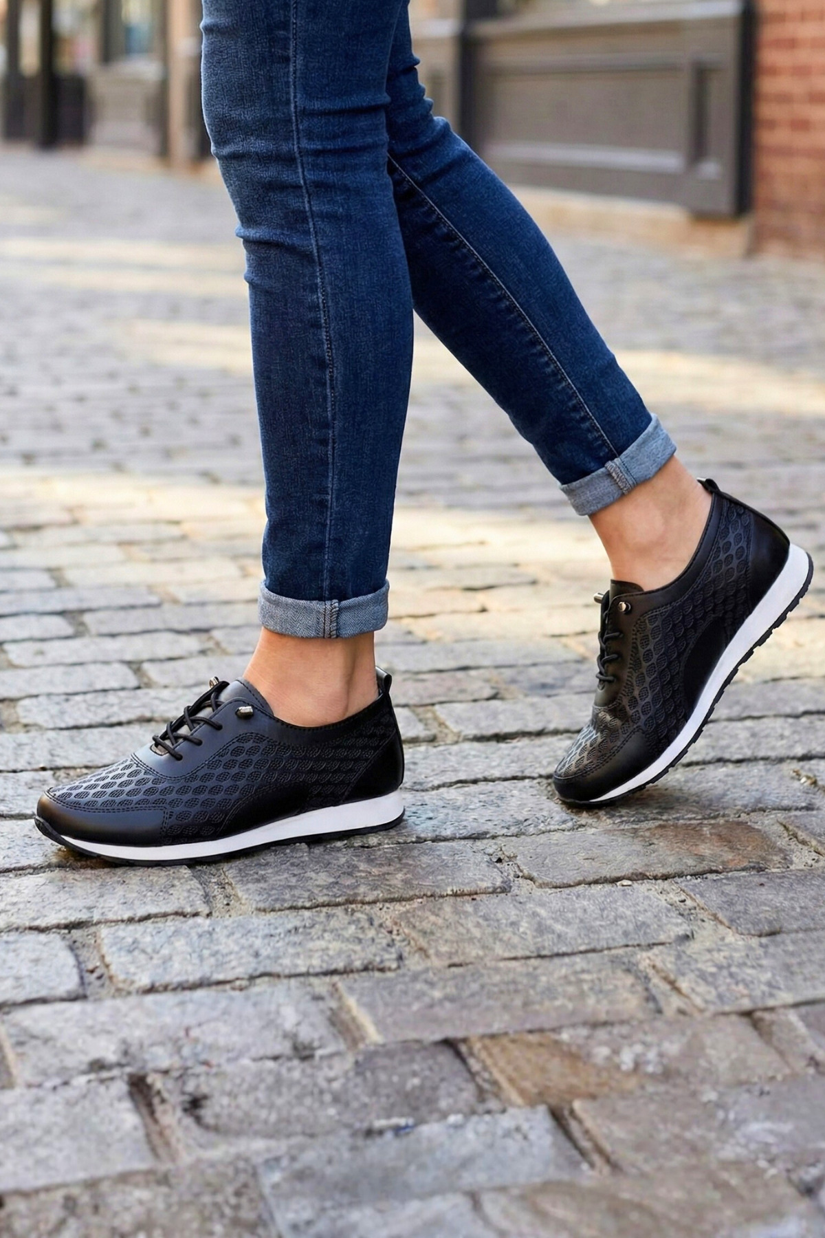 kadın siyah spor ayakkabı, hafif yapısı ve nefes alabilen yüzeyi sayesinde gün boyu rahat bir kullanım sunar. Ayağı saran bağcıklı yapısı güvenli adım atmanıza yardımcı olurken, esnek tabanı yürüyüş sırasında ekstra konfor sağlar.Modern ve zarif tasarımı sayesinde spor kombinlerden jean ve elbiselere kadar birçok kombinle uyum sağlar. Günlük kullanım, uzun yürüyüşler ve yoğun tempolu günler için ideal bir modeldir.